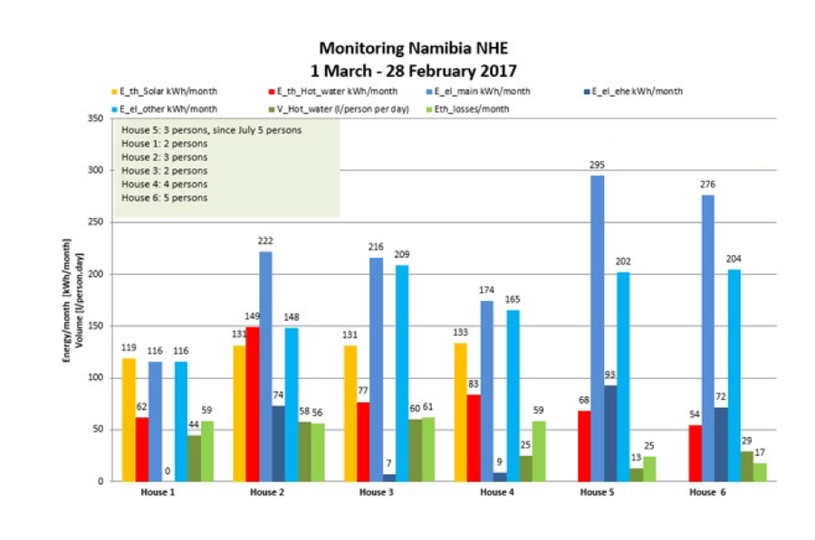 SOLTRAIN has financed monitoring equipment that is now installed at four of the 62 houses equipped with solar water heating systems (SWH), and at two houses meeting their hot water requirements through electric geysers. The low cost houses low cost were constructed by the National Housing Enterprises (NHE), in Otjomuise, Windhoek. Additional monitoring equipment has also been installed at a residential house in Dorado Park and at Joe’s Beer house.