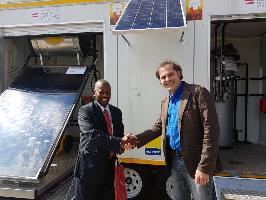 The handing-over ceremony of a solar trailer to the University of Botswana’s Clean Energy Research Centre (CERC) took place in early March at the university’s Conference Centre. The 25,000.00 EURO trailer was donated to the institution by SOLTRAIN. During the ceremony, the keys to the trailer were handed over by Mr Rudi Moschik from AEE-INTEC to Deputy Vice Chancellor Academic and Student Affairs, Professor Martin M. Mokgwathi.
