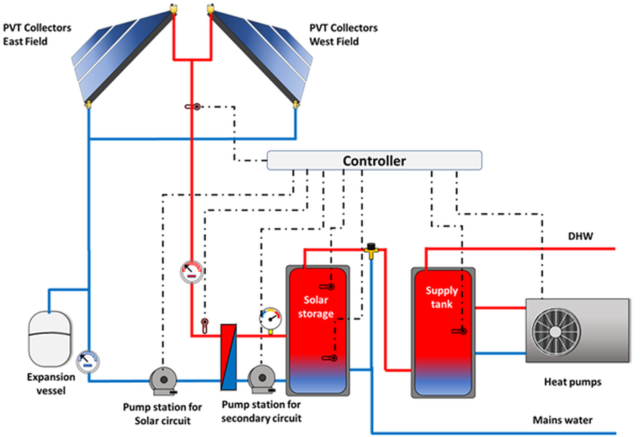 The system integrates photovoltaic–thermal (PVT) collectors covering 200 m² with modular water-to-water heat pumps (100 kW nominal heating capacity) and a heat-recovery subsystem to meet 100 % of the hospital’s domestic hot-water demand. The PVT field simultaneously generates heat and electricity—solar thermal energy provides direct water heating, while solar electricity offsets the power used by the heat pumps. Together, these technologies enable fully renewable hot-water production on an annual energy balance.